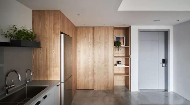 進門的右手邊用原木打造鞋柜和餐邊柜的組合柜,還特意設置了冰箱的位置。