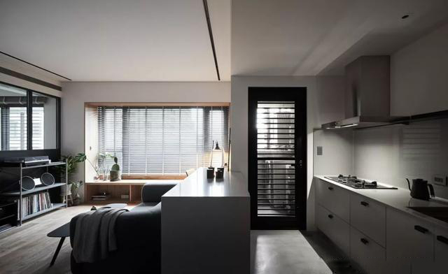 整個空間做成開放式的格局,基本就是黑色、白色、灰色、原木,再無其他艷麗的色彩了。入戶玄關地面開始就做水泥自流平地面,以及客廳臥室直接過渡成地板。